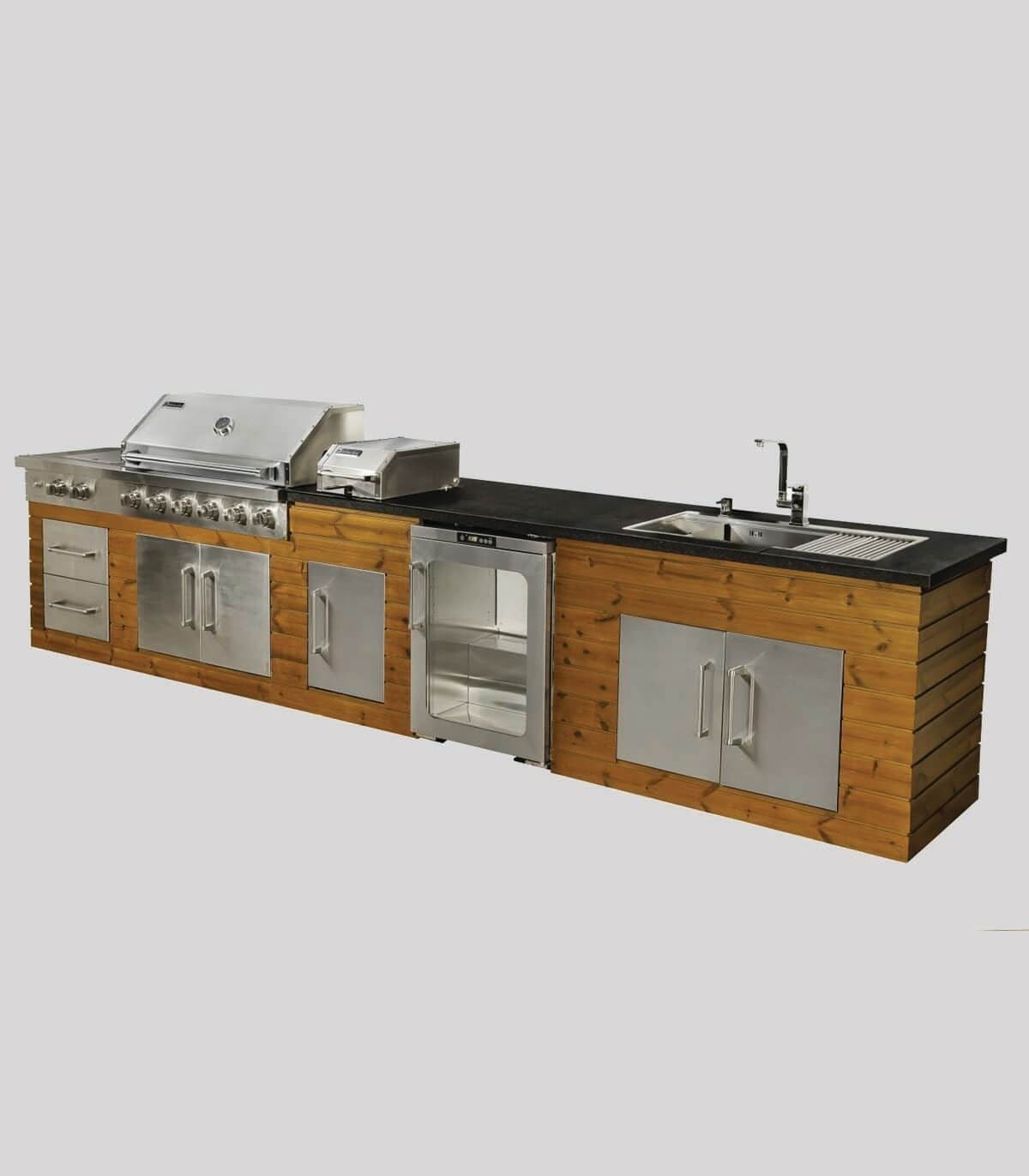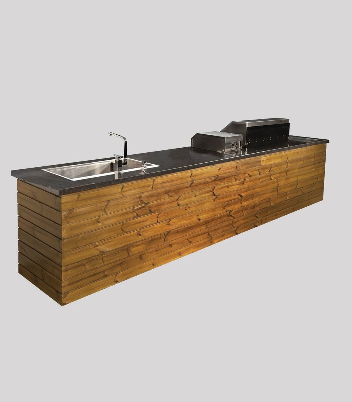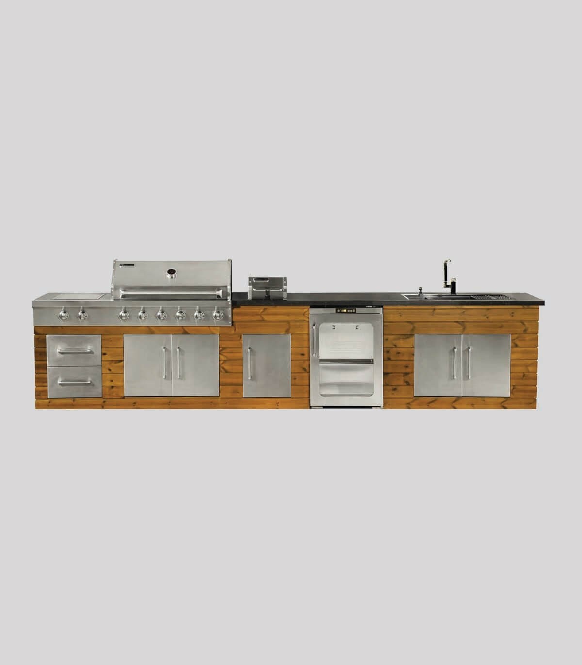 باربیکیو آیلند طرح خطی ترموود جهان گاز، تلفیقی از طراحی گرم چوب و مقاومت سنگ است که تجربهای لوکس از آشپزی در فضای باز ارائه میدهد.
